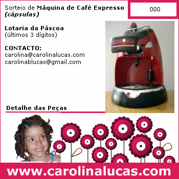 Temos ainda muitas RIFAS para vender no meu BAZAR (anda à roda dia 25/04): PRÉMIO: Máquina de Café Expresso (Cápsulas) SORTEIO: Lotaria da Páscoa (últimos 3 dígitos) VALOR: 1 Rifa = 1 Sol ONDE COMPRAR: http://www.carolinalucas.com/b azar MODO DE ENVIO: por email Não queres tentar a sorte? Agradeço muito! É uma grande ajuda para a continuação dos meus tratamentos em Cuba.